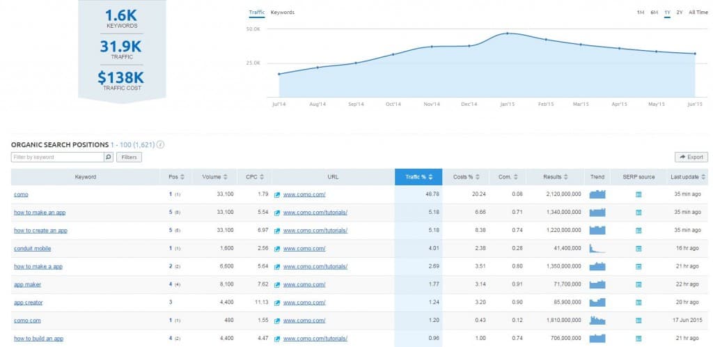 The long-tail keyword research played a critical role in the long term traffic growth to the website. As a result of creating well-optimised, highly shareable content, the site now ranks on page one of Google for terms like ‘app ideas’ and ‘app promotion