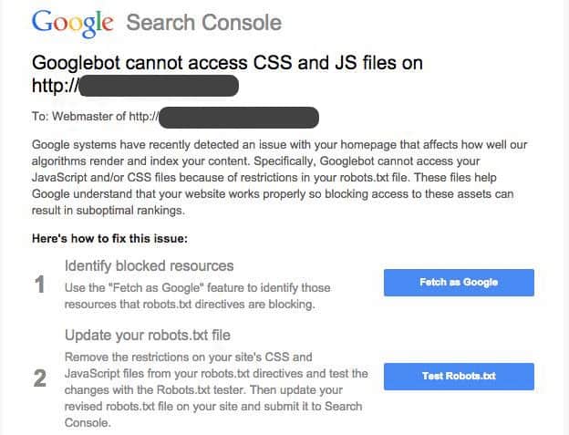 Lots and lots of people are getting “Googlebot can’t access CSS or JS files” that looks like this: