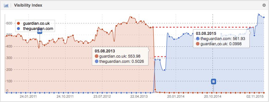 Both the domain name change for Theguardian.com and Dunelm.com make it clear that Google may not immediately transmit all the quality signals from the old domain name to the new. It may come as a surprise that Google actually needs some time to move all the important quality signals, such as authority, reputation, trust, user signals and the internal PageRank budget for crawling and indexing, between the two domains. This is, in part, due to the fact that Google has to crawl all internal links and pages on the old website once again to identify all redirects, in order to transfer the quality signals to the new domain.