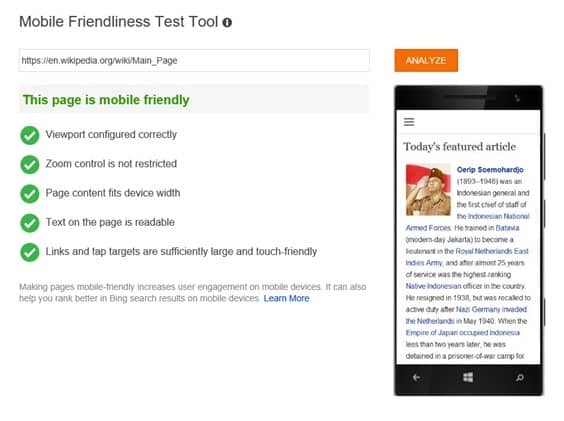 When you submit the URL of a page to be analyzed to the Mobile Friendliness Test tool, our Bing Mobile crawler fetches and renders the page, extracting important features that are used by the tool to determine how the page performs against each of the above factors. The outcomes are then aggregated into a consolidated mobile-friendliness verdict for the page.
