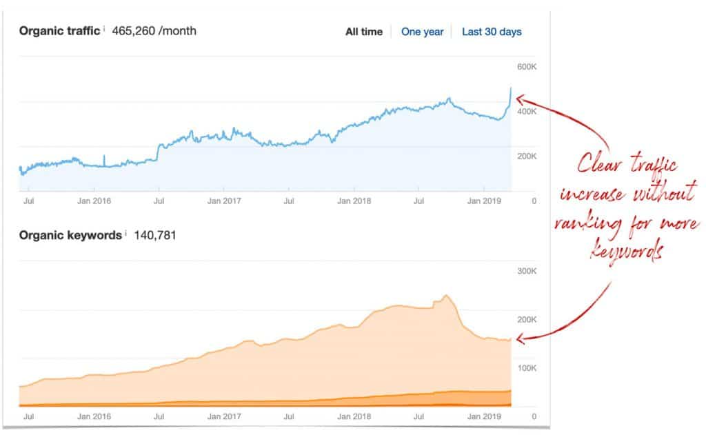 The reason it’s an important discovery is because this indicates that sites are increasing in traffic because of higher rankings… and NOT because they are explicitly ranking for more keywords.